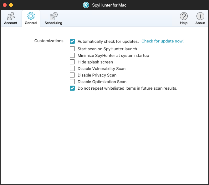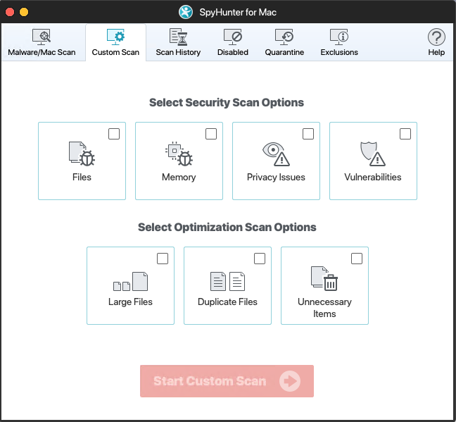 SpyHunter for Mac provides its users with options to customize their scans. Users can scan files, memory, browser cookies, privacy issues, and vulnerabilities.