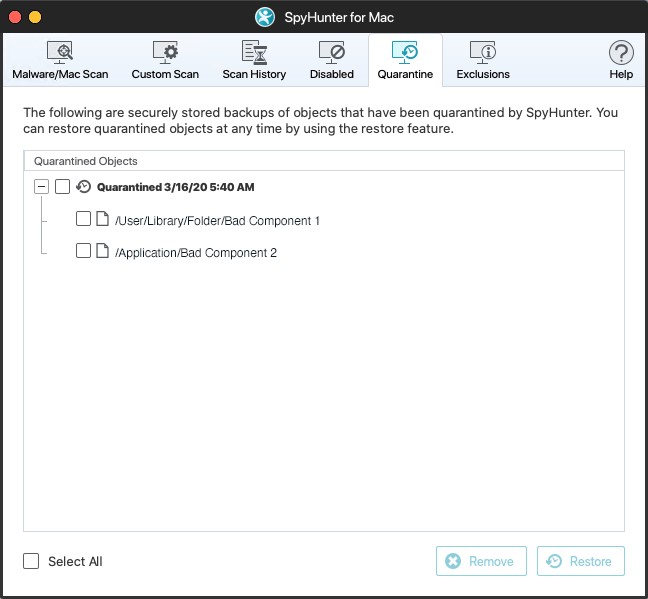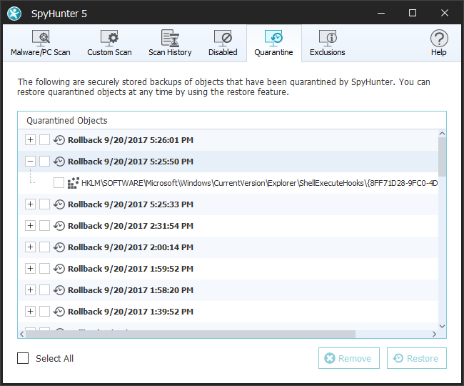 Objects removed by SpyHunter are securely encrypted and safely stored in SpyHunter’s isolated Quarantine area. Users can restore objects from Quarantine after the removal process, if desired. Alternatively, users can permanently remove objects from Quarantine.