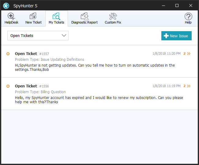To ensure complete malware removal and customer satisfaction, SpyHunter comes with an integrated personalized one-on-one technical support service, the SpyHunter HelpDesk. Subscribers can report any issues they encounter, generate and transmit diagnostic reports, and receive specialized custom fixes directly in SpyHunter.